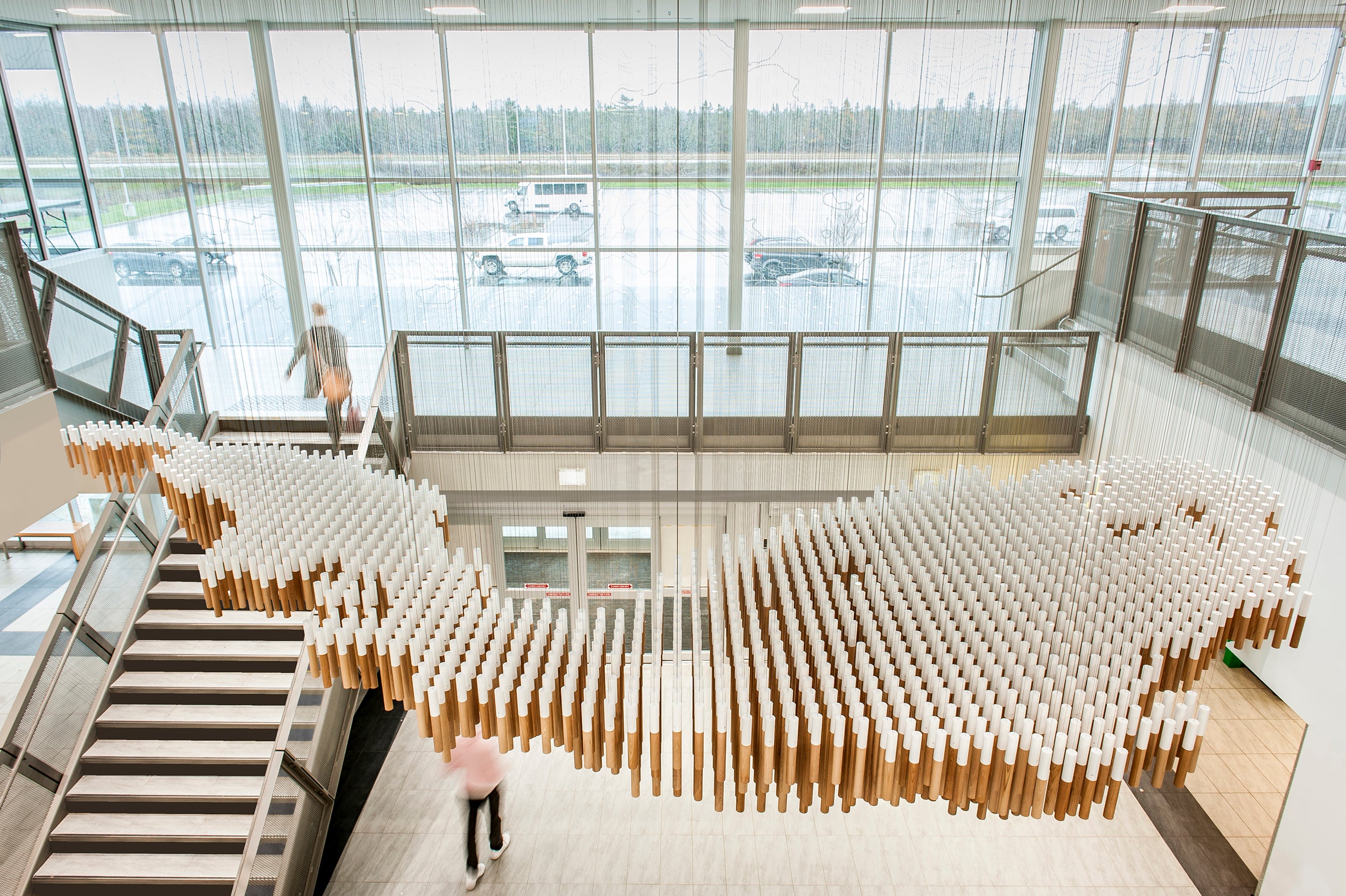 We worked with the architects of Passage Studio to create an elegant suspended sculpture of 1500 white oak dowels mapping the bathymetry of local lakes for this cutting edge ice skating facility.