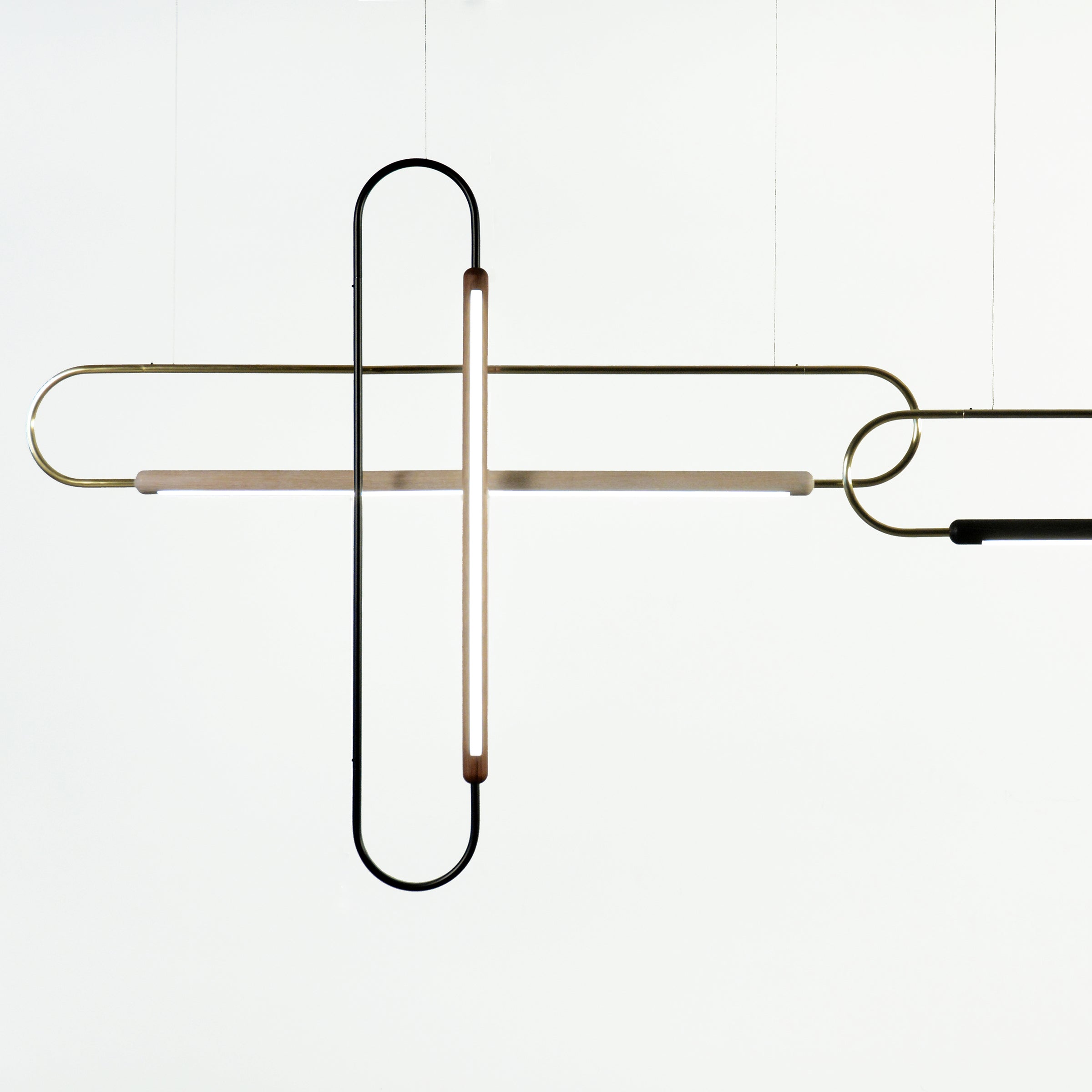 Link Vertical Pendant (walnut | natural + black powder coat) and Link Horizontal Pendant (w.oak | black + copper)