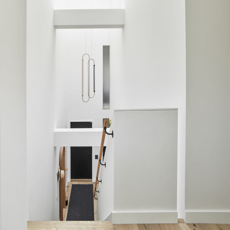 Link Vertical Pendant (w.oak | white + stainless) and Link Vertical Pendant (w.oak | black + brass)